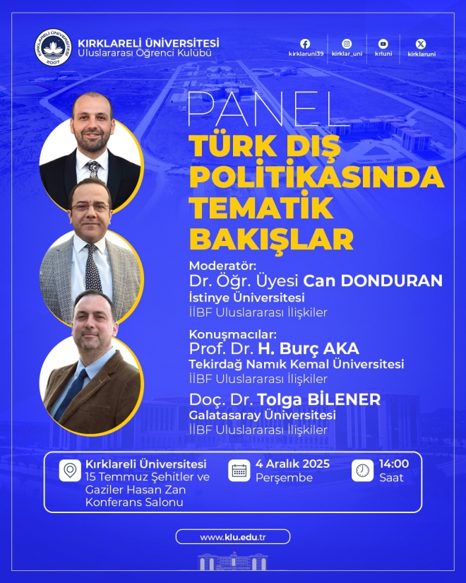 Panel, İstinye Üniversitesi İİBF Uluslararası İlişkiler Bölümü öğretim üyesi Dr. Öğr. Üyesi Can Donduran moderatörlüğünde gerçekleştirilecektir. Etkinliğin konuşmacıları ise Tekirdağ Namık Kemal Üniversitesi İİBF Uluslararası İlişkiler Bölümü öğretim üyesi Prof. Dr. H. Burç Aka ve Galatasaray Üniversitesi İİBF Uluslararası İlişkiler Bölümü öğretim üyesi Doç. Dr. Tolga Bilener olacaktır.