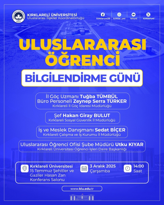 Kırklareli Üniversitesi Uluslararası İlişkiler Koordinatörlüğü tarafından uluslararası öğrencilerin Türkiye’deki yasal yükümlülükler, sosyal güvenlik hakları ve üniversite içi süreçler konusunda bilgilendirilmesini amaçlayan “Uluslararası Öğrenci Bilgilendirme Günü” düzenlenecektir. Etkinlik, 3 Aralık 2025 Çarşamba günü Saat 14.00’te Hasan Zan Konferans Salonu’nda gerçekleştirilecektir.