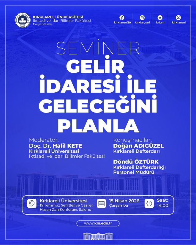 Moderatörlüğünü, Maliye Bölümü Öğretim Üyesi Doç. Dr. Halil Kete’nin üstleneceği etkinliğe Kırklareli Defterdarı Doğan Adıgüzel ve Kırklareli Defterdarlığı Personel Müdürü Döndü Öztürk konuşmacı olarak yer alacaktır.